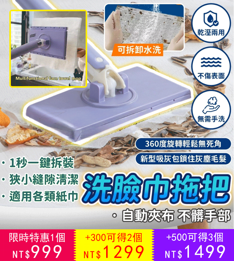 4分鐘前免手洗懒人伸縮拖把,新升級設計,不在擔心拖把不好弄,新升級長度設計,同時不沾手放人工擰拖把,使打掃變得簡單 - 【今日限定 買三送三 6把+ 拖布*6包 】-NT$1499